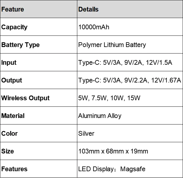 The MagSafe Aluminum Power Bank 10000mAh offers fast charging with Type-C and wireless options. Its sleek aluminum design, LED display, and MagSafe compatibility make it a premium.