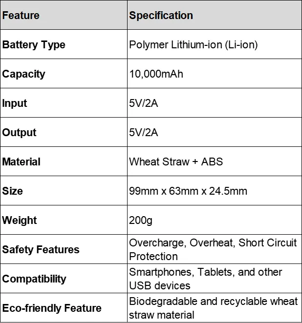 This eco-friendly 10,000mAh mini power bank combines polymer lithium-ion battery technology with wheat straw + ABS material. It features 5V/2A input/output for fast charging, compact size (99*63*24.5mm)