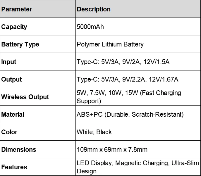 This Ultra-Slim 5000mAh MagSafe Power Bank offers 15W wireless charging and fast Type-C input/output. With a sleek design, LED light indicator, and MagSafe compatibility