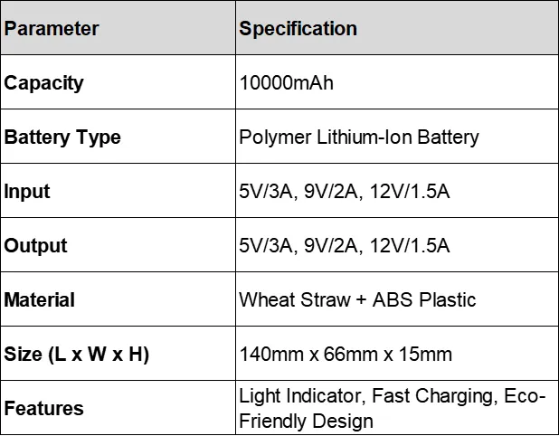 This 10000mAh portable power bank offers fast charging with multiple output options (5V/3A, 9V/2A, 12V/1.5A). Made from eco-friendly wheat straw and ABS material, it features a light indicator and a compact design, perfect