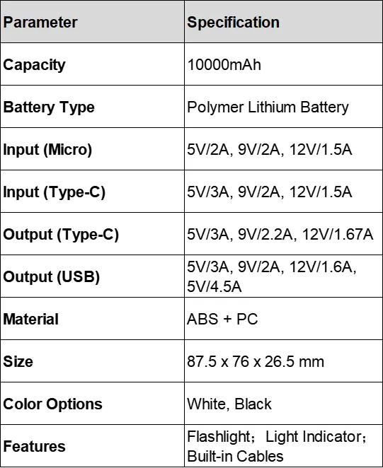 This 10000mAh power bank features fast 22.5W charging with multiple input/output options, built-in cables, LED display, and a flashlight. Its polymer lithium battery, compact ABS+PC design