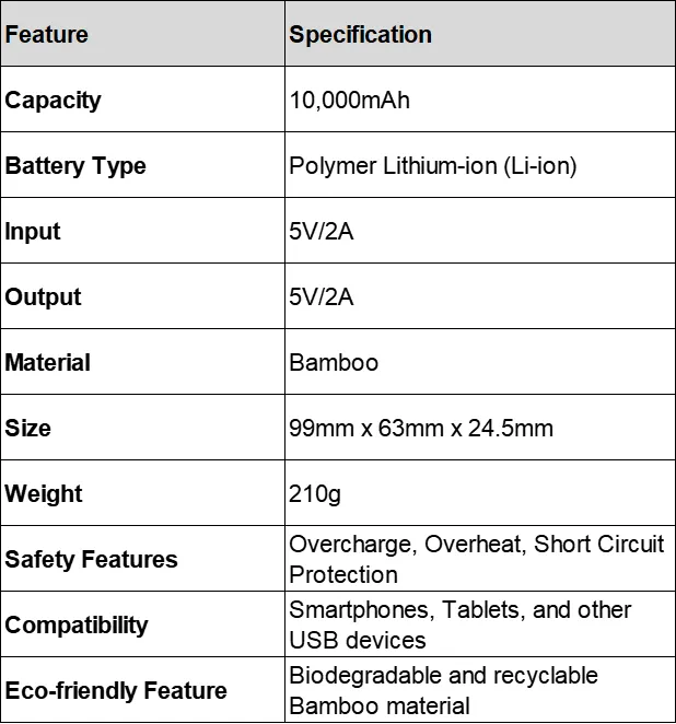 This 10,000mAh power bank features a polymer lithium-ion battery with 5V/2A input/output. Made from sustainable bamboo, it offers eco-friendly charging on the go, with a light indicator for power status