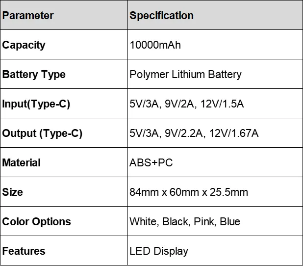 Compact & Lightweight Design:Designed for portability, the power bank is compact (84mm x 60mm x 25.5mm) and lightweight (approx. 200g), making it easy to carry in your bag or pocket. It's the perfect companion for everyday use or travel, offering convenience without the bulk.