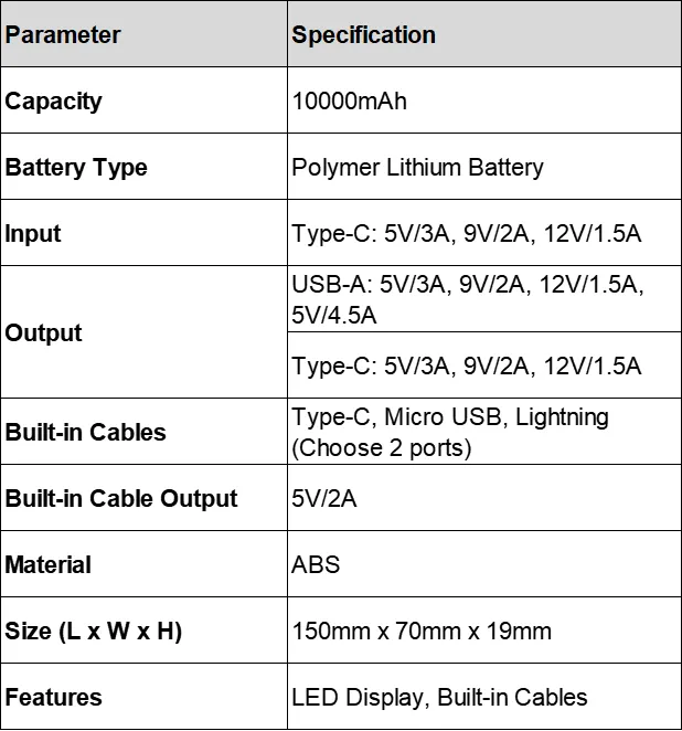 Built-in Type-C, Micro, and Lightning Cables:This power bank features built-in Type-C, Micro USB, and Lightning cables, allowing you to charge multiple devices without the need to carry extra cables. Choose from two available ports, making it more convenient and eliminating the hassle of tangled cords while on the go.