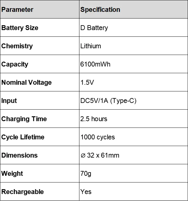 This rechargeable Lithium D battery offers 6100mWh capacity, 1.5V nominal voltage, and fast Type-C charging. With a 2.5-hour charge time and 1000 cycles, it's perfect for long-lasting power in various devices