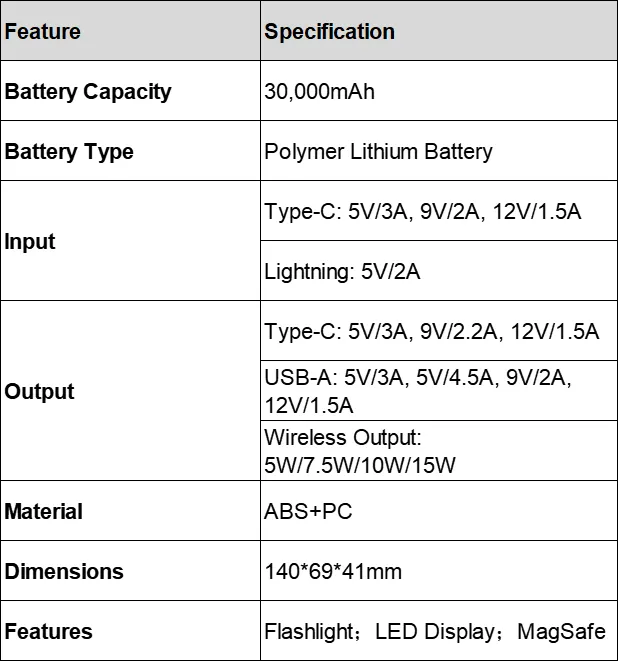 MagSafe Power Bank емкостью 30 000 мАч поддерживает быструю зарядку с выходами Type-C, Lightning и беспроводным подключением. Он предлагает прочную конструкцию из ABS+PC, светодиодный дисплей и совместимость с MagSafe.